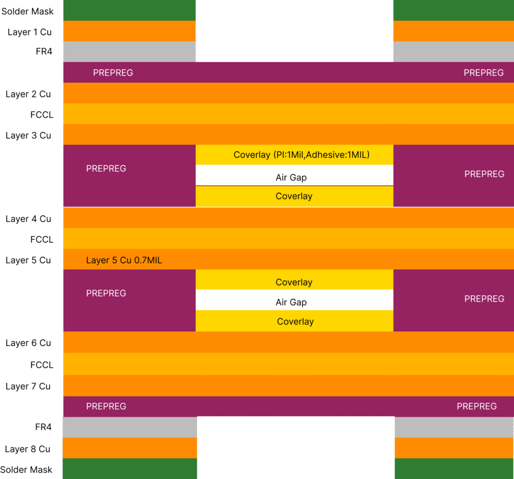 In this example, the board has an 8-layer structure. The number of layers can vary based on your requirements, typically ranging from 4 to 16 layers or more. A key part of this design is that the flexible layers must be located in the center of the overall stackup.