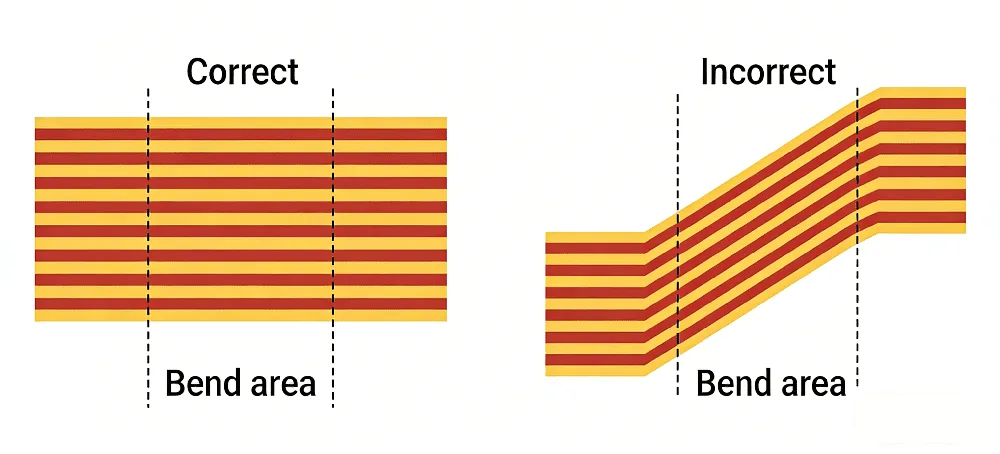 - Trace Direction: Keep traces in a straight line and perpendicular to the bend line whenever possible. This helps distribute stress during bending. Do not stack traces directly on top of each other between layers; instead, use a staggered (zipper) layout to reduce the risk of fracture and increase flexibility.