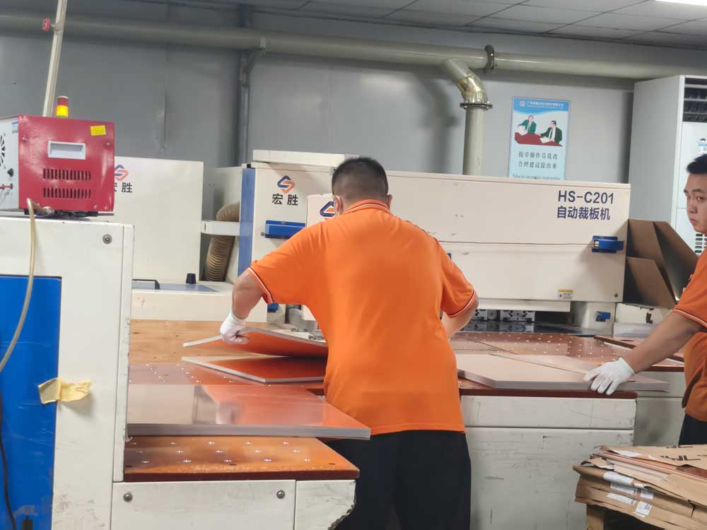 Large copper-clad laminate panels are cut into production-sized sheets according to the Manufacturing Instruction.
