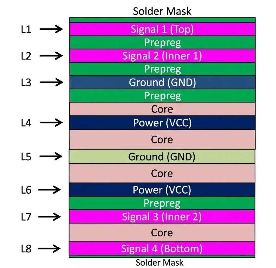 Choosing the right PCB stackup is the foundation of a successful 8-layer PCB design. A well-planned stackup helps control impedance, reduce EMI, and ensure reliable high-speed signal transmission.To help you balance performance, cost, and manufacturability, we summarize several proven structures used in the industry. Below are three recommended 8-layer PCB stackup configurations for different application needs.